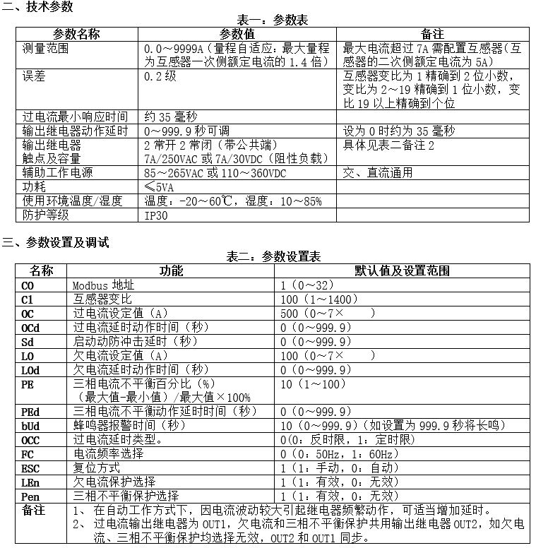 ●欠電流:當(dāng)某相電流小于欠電流設(shè)定值,且持續(xù)時(shí)間超過(guò)欠電流延時(shí)設(shè)定值,輸出繼電器吸合,電流正常時(shí)欠電流輸出繼電器釋放。