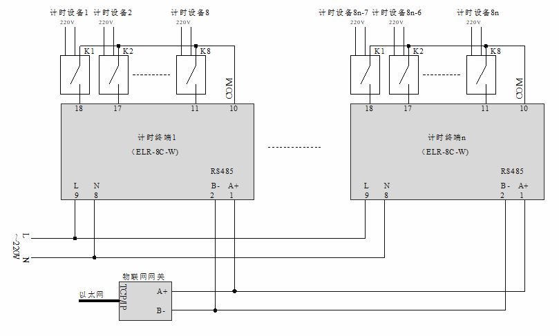 以下是使用8路計時器(型號ELR-8C-W)對多個設備工作時間進行統(tǒng)計的計時系統(tǒng)結構圖: