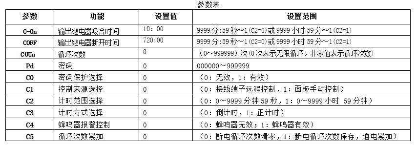 說明:圖中2/3端子為外接循環(huán)定時(shí)器的無源開關(guān)啟動(dòng)信號(hào),如需通電直接啟動(dòng),可短接2/3端子,6/7為內(nèi)部輸出的無源常開觸點(diǎn),由on、off時(shí)間控制通斷,此電路控制供水電磁閥,9/10為定時(shí)器工作電源。如噴淋10分鐘,停12小時(shí),循環(huán)運(yùn)行,各參數(shù)設(shè)置如下: