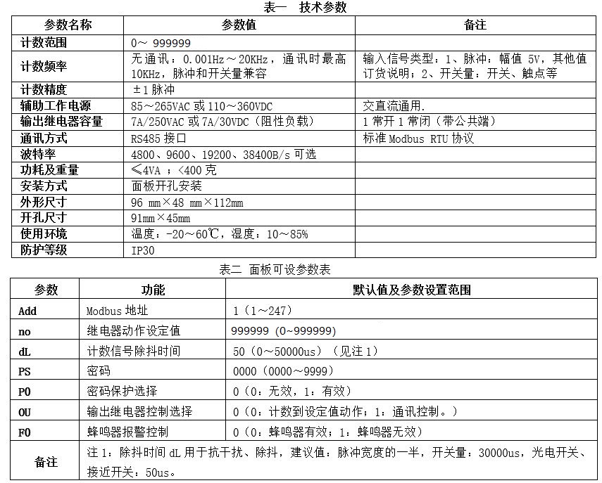 (4)Modbus協(xié)議通訊:可與上位機(jī)、PLC或其他控制器通訊,通訊接口為RS485,可即時(shí)采集計(jì)數(shù)器的計(jì)數(shù)值和相關(guān)狀態(tài)參數(shù),亦可對(duì)計(jì)數(shù)器參數(shù)設(shè)置及計(jì)數(shù)遠(yuǎn)程控制。