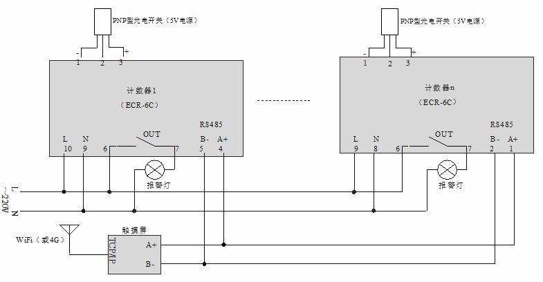 下圖為多個(gè)計(jì)數(shù)器組網(wǎng)的應(yīng)用接線圖,底層通訊為RS485總線,總線接入觸摸屏,通過(guò)觸摸屏的應(yīng)用軟件實(shí)現(xiàn)對(duì)計(jì)數(shù)的綜合管理,觸摸屏可選擇WiFi或4G接口,接入以太網(wǎng),實(shí)現(xiàn)觸摸屏、電腦和手機(jī)的同屏操控。