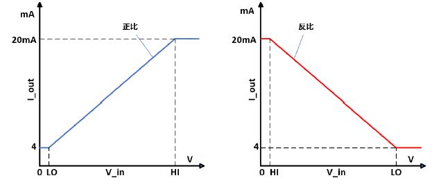 圖中HI、LO為輸出電流的上、下限對應(yīng)的輸入電壓范圍,通過設(shè)置HI、LO值可調(diào)節(jié)輸出電流對應(yīng)輸入電壓的變化區(qū)段,也可以調(diào)節(jié)輸出電流跟隨輸入電壓是按正比例或是按反比例變化。