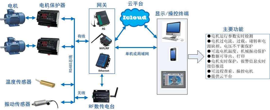 系統(tǒng)可根據(jù)用戶現(xiàn)場情況提供有線和無線多種組網(wǎng)方式(如下圖),用戶只需購買電機(jī)保護(hù)器和物聯(lián)網(wǎng)網(wǎng)關(guān),按圖完成現(xiàn)場簡單接線,無需安裝軟件,直接通過手機(jī)掃碼或?yàn)g覽器使用,簡單方便